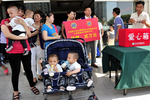 6月4日上午的西安中医脑病医院内,爱心涌动。来自社会各界的的爱心人士和组织赶到该院为福州四胞胎脑瘫儿捐款奉献爱心,福州四胞胎共得到募捐善款37290.9元。其中:中国狮子会联会陕西会员管理委员会候任主席刘文革和狮友们捐款2万元,一位不留姓名的女土捐款1万元,陈琳女土捐款1千元。西安中医脑病医院医护人员及住院患者家属纷纷献出爱心捐赠款6000余元。银桥乳业捐赠价值5000元的阳光宝宝奶粉4箱。